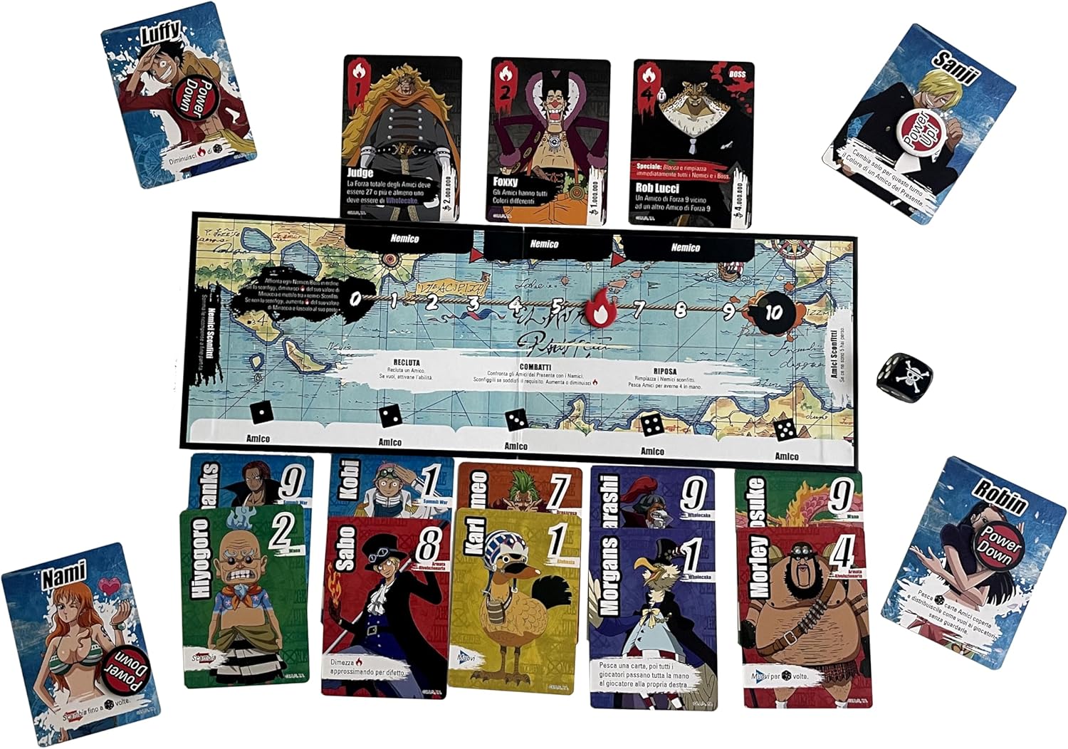 Salpa per la Rotta Maggiore! One Piece Nakama - Amici & Nemici è un gioco da tavolo cooperativo (per 1-5 giocatori, età 10+) ambientato nell'incredibile mondo di Eiichiro Oda. L'obiettivo? Reclutare nuovi Amici (Nakama), sconfiggere i Nemici e raccogliere le loro taglie per diventare il Re dei Pirati!