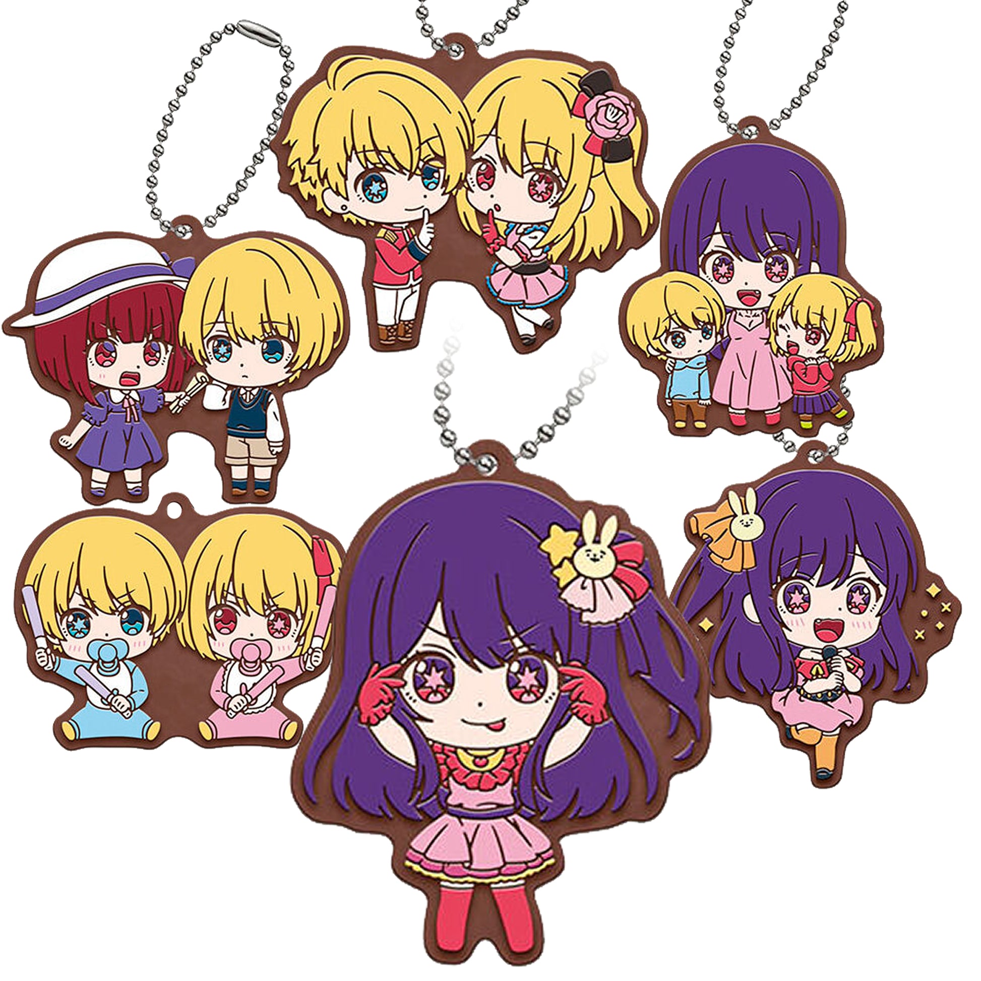 Dall’acclamato manga Oshi no Ko arriva la prima serie di mascotte in gomma in stile chibi! Con adorabili versioni di Ai Hoshino, Aqua, Ruby e altri personaggi iconici in varie pose e combinazioni, questi portachiavi da collezione (circa 6 cm) sono perfetti per personalizzare il tuo zaino o per arricchire la tua collezione di gadget.