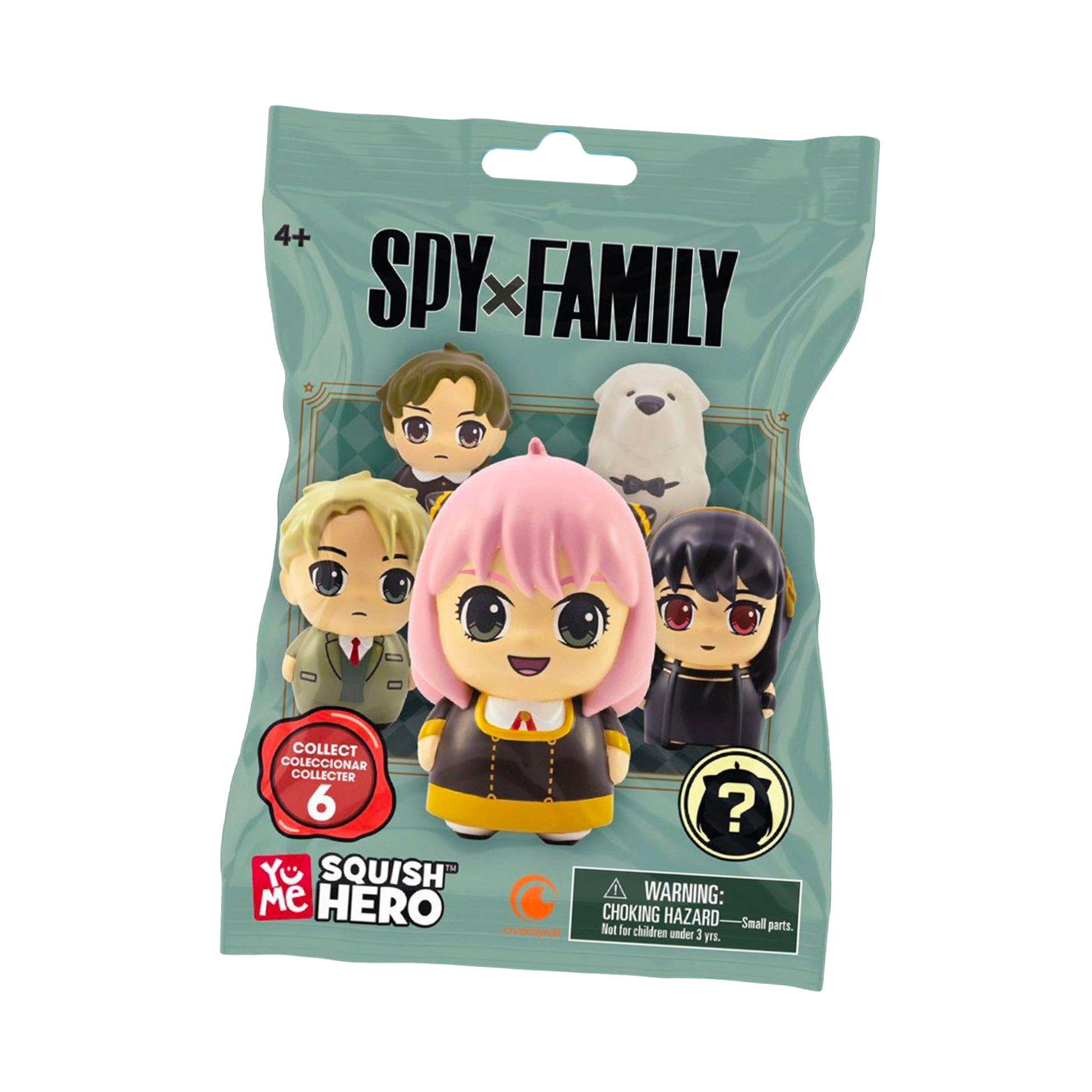 Mini-figure "Spy x Family Squish Hero" alte circa 8 cm, realizzate in morbida plastica foam, confezionate in blind box gravity feed di Yume Toys; ogni bustina contiene uno dei sei personaggi da collezionare: Loid Forger, Yor Forger, Yuri Briar, Bond Forger, Anya Forger scuola e Anya Forger famiglia.