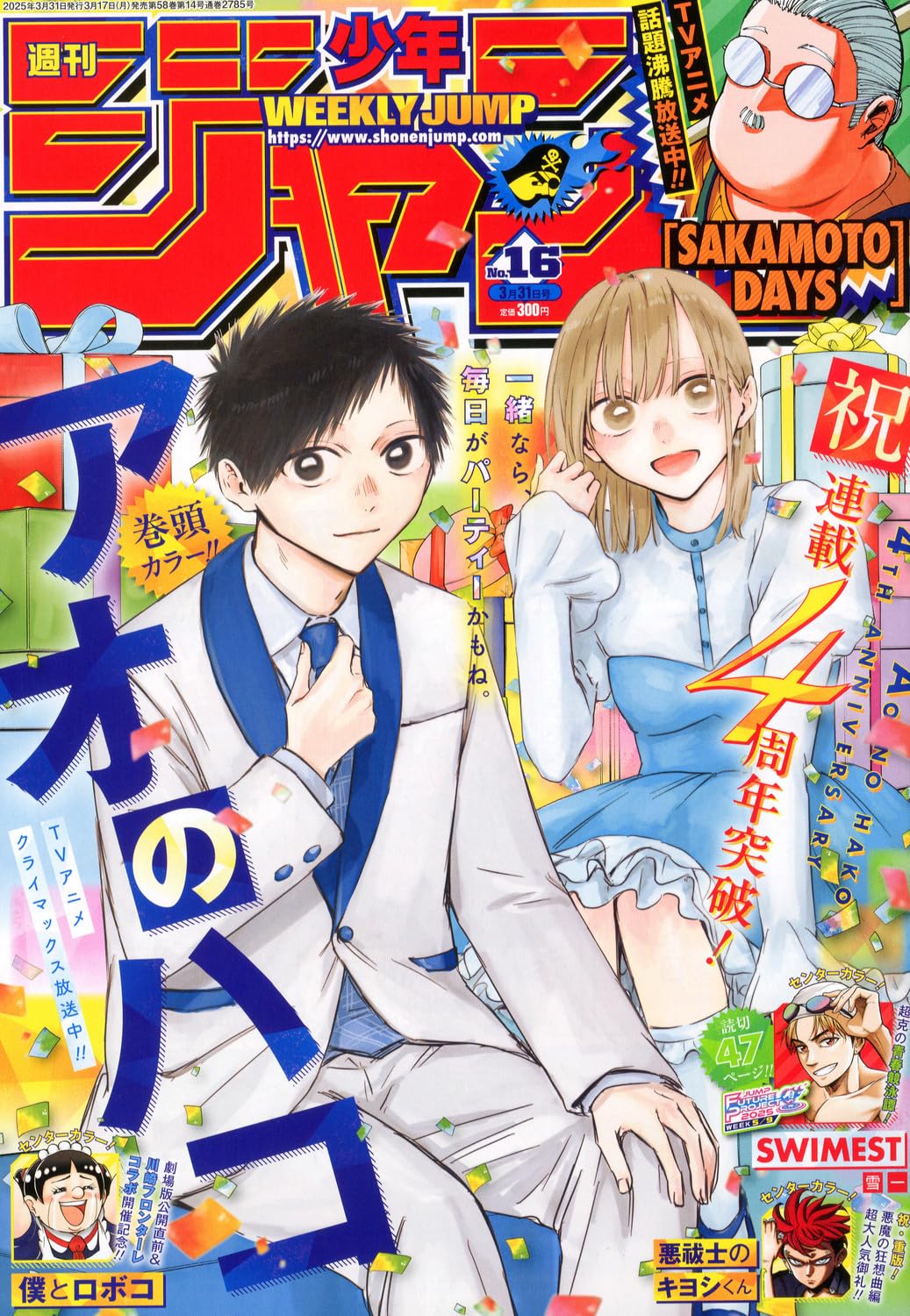 Il numero 16 di Weekly Shonen Jump, pubblicato in Giappone il 17 marzo 2025, celebra il quarto anniversario di Blue Box, che conquista la copertina e la pagina a colori principale.