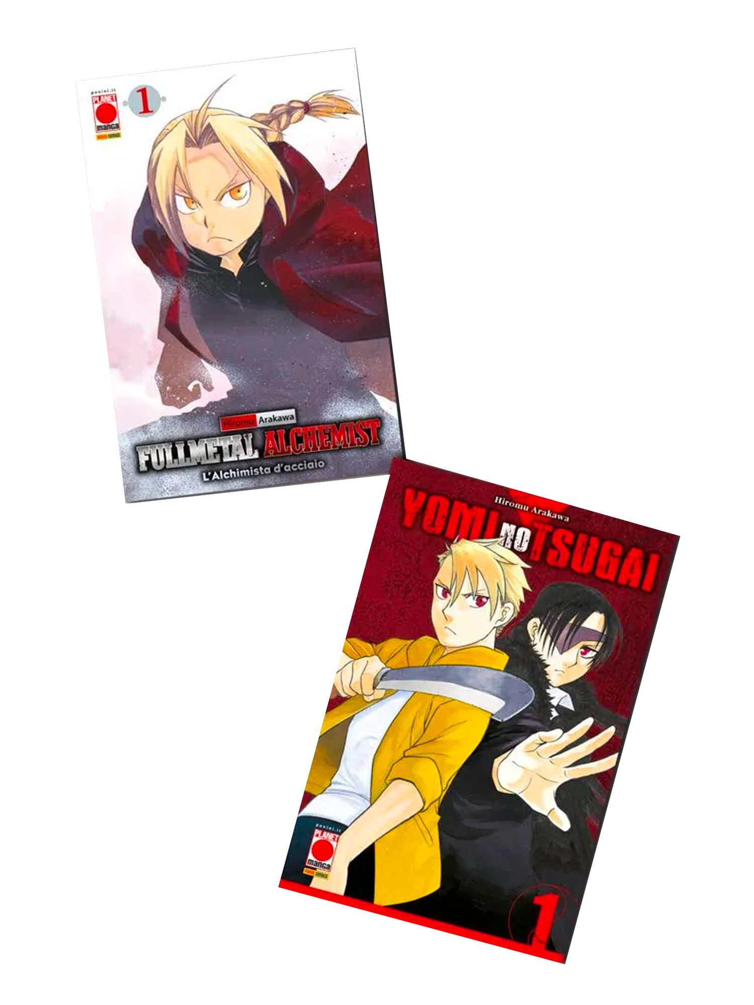 L’opera più recente della sensei Hiromu Arakawa assieme al suo più grande successo. non perdere il primo numero di Yomi no tsugai con un’esclusiva copertina variant in bundle con il primo numero di Fullmetal Alchemist con un’esclusiva copertina variant.